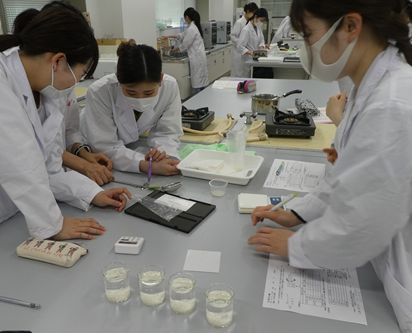学位を取得して3年後に名古屋女子大学食物栄養学科(管理栄養士養成)の専任講師に採用されました。そこでの担当教科は、調理科学、食品学、食品加工学、調理科学実験などです。調理科学実験は、食品の調理過程の変化を理論だけでなく実験を通して確認し、理解を深めることができます。実験の様子の写真です。米の浸漬実験を行っています。