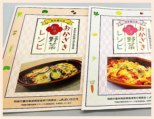 連携としては、藤川のまちづくり協議会やJAあいち三河と提携を結んでおり、2023、2024年度では、四季を通じた岡崎野菜のレシピ集を作成することができました(以下の写真)。